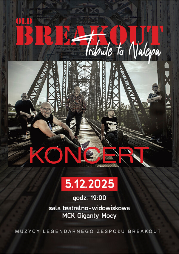 Miejskie Centrum Kultury w Bełchatowie zaprasza na koncert zespołu Old Breakout, który odbędzie się 5 grudnia 2025 r. o godzinie 19:00 w sali teatralno – widowiskowej MCK Giganty Mocy.