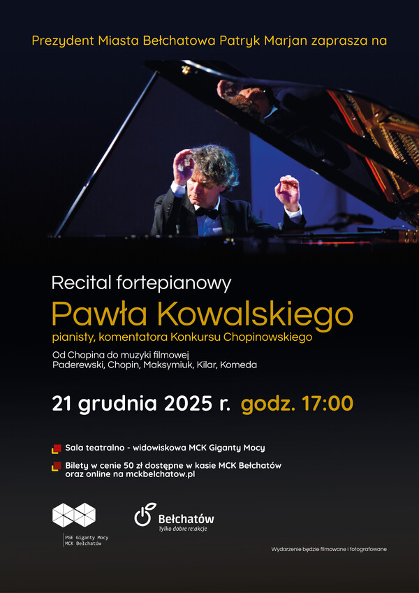 Prezydent Miasta Bełchatowa Patryk Marjan zaprasza na koncert „Paweł Kowalski – Recital fortepianowy”, który odbędzie się 21 grudnia br. o godzinie 17:00 w sali teatralno-widowiskowej MCK Giganty Mocy.