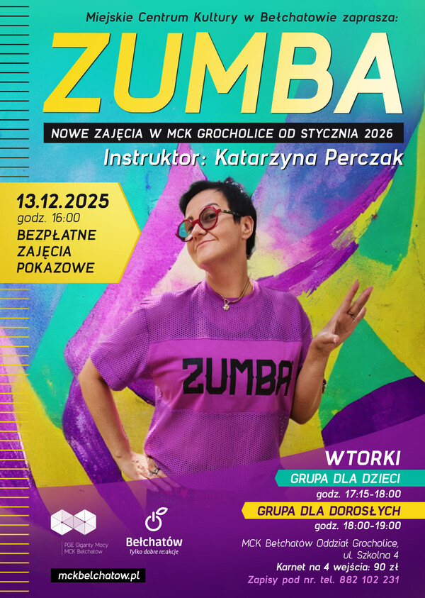 Miejskie Centrum Kultury zaprasza na zajęcia pokazowe z zumby, które odbędą się 13 grudnia br. o godz. 16:00 w MCK Grocholice przy ulicy Szkolnej 4