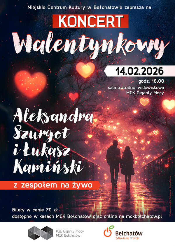 Walentynki w Miejskim Centrum Kultury zapowiadają się wyjątkowo muzycznie i romantycznie. Już 14 lutego o godzinie 18:00 w sali teatralno-widowiskowej MCK Giganty Mocy odbędzie się koncert, który będzie idealną propozycją na święto zakochanych – zarówno dla par, jak i wszystkich miłośników muzyki na żywo. Na scenie wystąpią Aleksandra Szurgot oraz Łukasz Kamiński z zespołem, gwarantując wieczór pełen emocji, nastrojowych dźwięków i teatralnej energii.