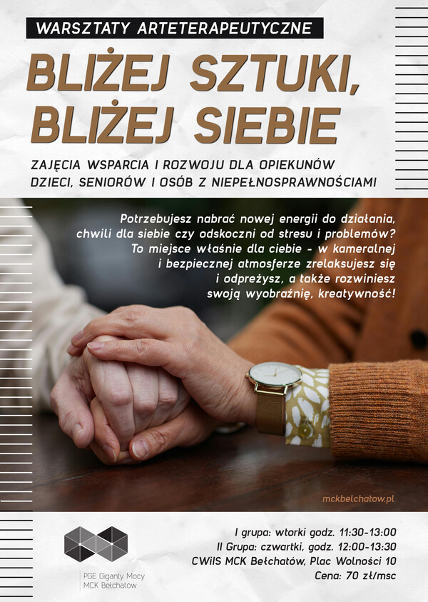 „Bliżej sztuki, bliżej siebie” to zajęcia arteterapeutyczne dla opiekunów dzieci, seniorów i osób z niepełnosprawnościami. Potrzebujesz nabrać nowej energii do działania, chwili dla siebie czy odskoczni od stresu i problemów? To miejsce czeka właśnie na Ciebie - w kameralnej i bezpiecznej atmosferze zrelaksujesz się i odprężysz, a także rozwiniesz swoją wyobraźnie i kreatywność!